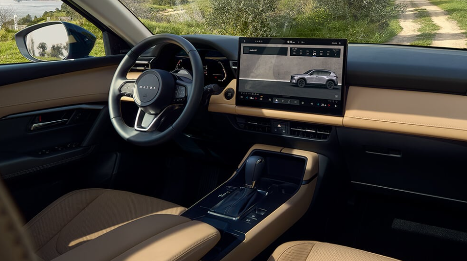 Tout d’abord, son empattement allongé de 4,5 pouces améliore considérablement le confort des passagers arrière, en offrant plus d’espace pour les jambes, les genoux et la tête, tout en bonifiant de façon notable le volume de chargement. Le CX-5 2026 se distingue ensuite par un écran tactile central livrable de 12,9-15,6 pouces dépendamment du modèle. Cet écran intègre des fonctionnalités de connectivité Google encore plus poussées et devient conséquemment le plus imposant jamais proposé par Mazda. D’autre part, l’habitacle est entièrement repensé. Il a été mis sur une interface épurée, avec moins de boutons physiques, au profit d’un écran tactile intuitif, d’applications intégrées et de commandes au volant. Cela permet ainsi une expérience de conduite encore plus fluide et résolument moderne.